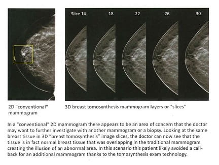 Until now, the best method of early detection has been digital mammography, using a specially designed camera and a computer to produce an image displayed on a high-resolution monitor. While digital mammography is still one of the most advanced technologies available, it is only a two-dimensional picture of the breast. Since the breast is composed of pockets of dense tissue surrounded by fat, the overlapping tissue in a digital image makes it difficult to see tiny spots called microcalcifications, and other subtle signs of early cancer.